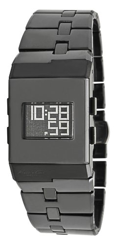 This Kenneth Cole digi-tech rectangle case shape from the digi-tech collection features: a black ceramic bezel, black LCD dial, black ceramic bracelet and digital chronograph.